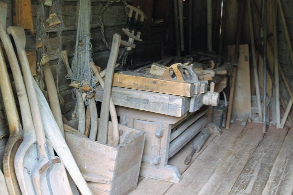 Entisöinti- ja muita tilan töitä on toteutettu paljon talkootyönä, muttei varmaankaan näillä aitassa olevilla vanhoilla työkaluilla.